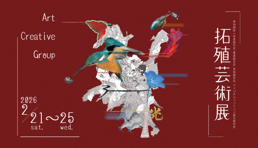 Art Creative Group ACGとは 拓殖大学の芸術・創作活動を行う研究会・サークルの親睦団体です。Read more 活動・イベント情報 拓殖芸術展(旧拓殖芸術祭)とは、ACG加盟団体による合同展示です。今年度は2026年2月に開催します。拓殖芸術展詳細> 加盟団体紹介 ACGは拓殖大学の芸術・創作活動を行う4団体で構成されています。 写真研究会 書道研究会 美術研究会 ディジタルコンテンツ研究愛好会 開催済みのイベント だれかの見たオレンジ展 拓殖大学紅陵祭にて開催 加盟団体合同展示〜自然〜 拓殖大学高尾祭にて開催 拓殖芸術祭 八王子オクトーレにて開催